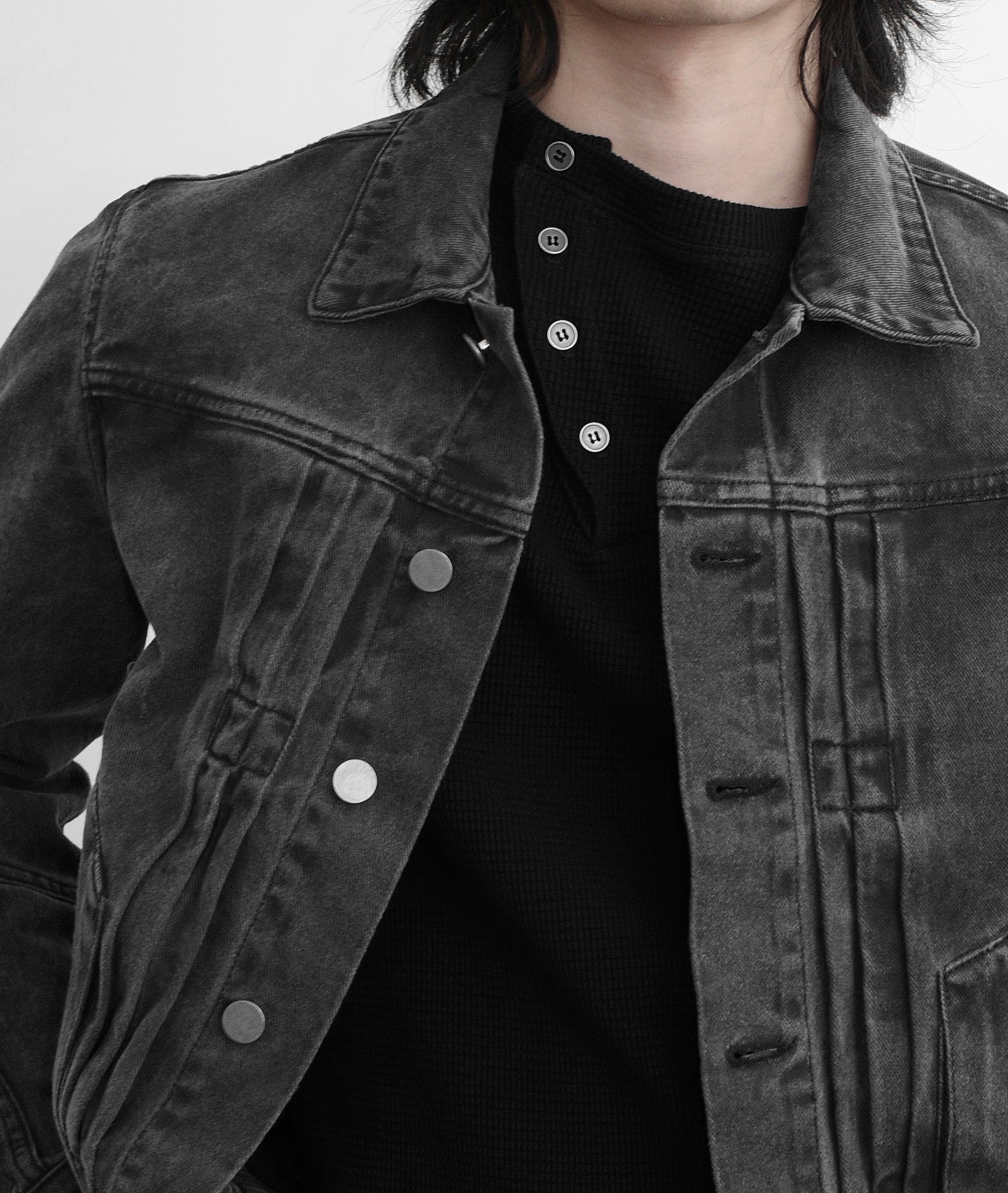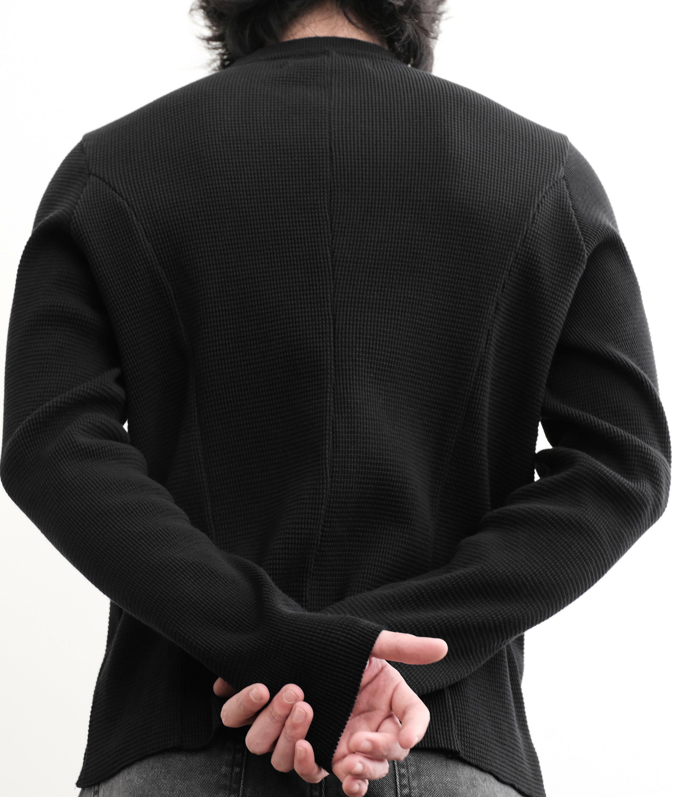 Textured thermal cottonFabric is dyed before destructionAsymmetrical button collarBack seam detailTwisted arm seamsRaw hemsMeticulously manufactured in Los Angeles, California.